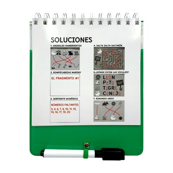 Cada página está plastificada, lo que permite reutilizar las actividades. Además, su formato anillado facilita el uso sin necesidad de apoyo adicional.