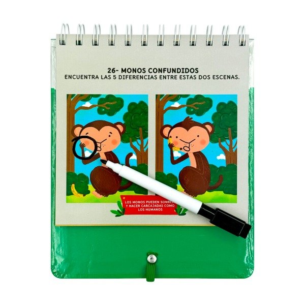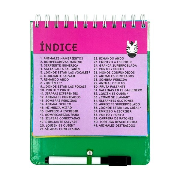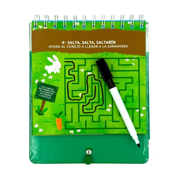 Incluye un fibrón con borrador, que se guarda en el mismo libro para llevarlo a todos lados: ¡perfecto para usar en casa, en un viaje o mientras esperan en una sala!