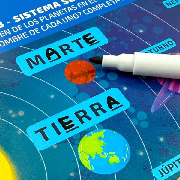Este cuaderno didáctico es ideal para niños y niñas curiosos que quieren saber más sobre el universo. Contiene 41 actividades ilustradas con temática espacial que se pueden escribir, borrar y volver a hacer las veces que quieran.