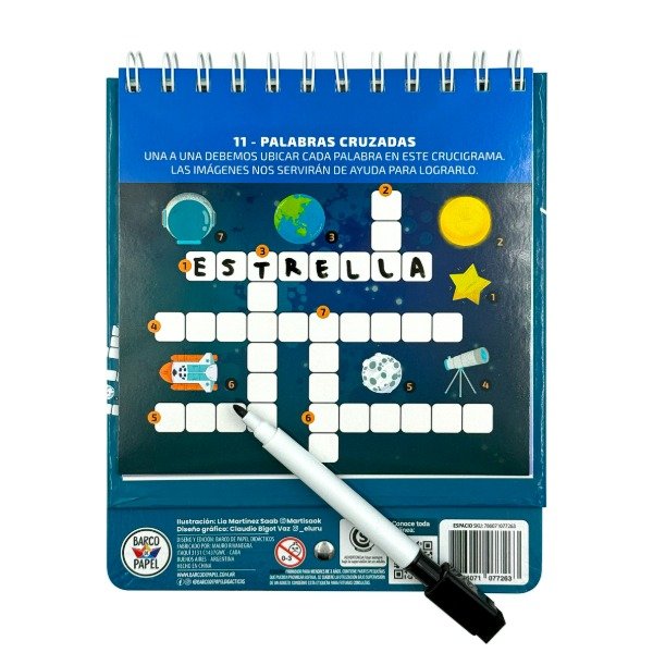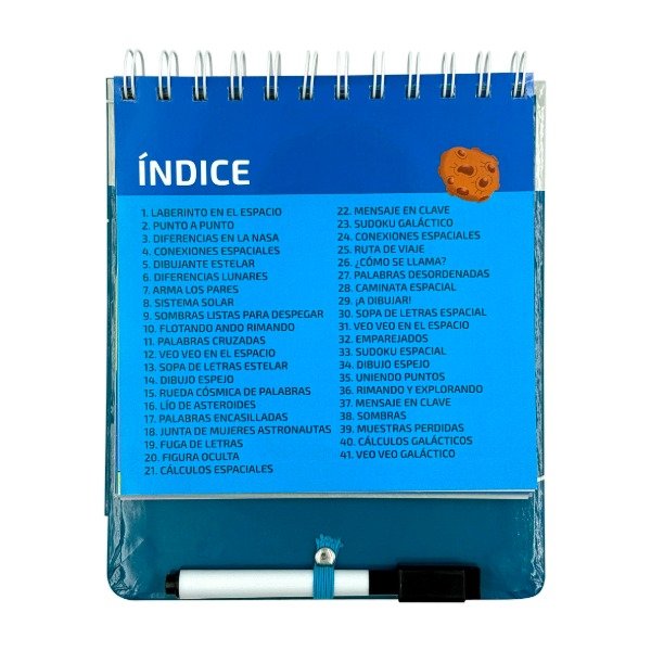 Incluye un marcador con borrador que se guarda en el mismo libro, ¡perfecto para llevar en la mochila y usar en casa, en el auto o de viaje!