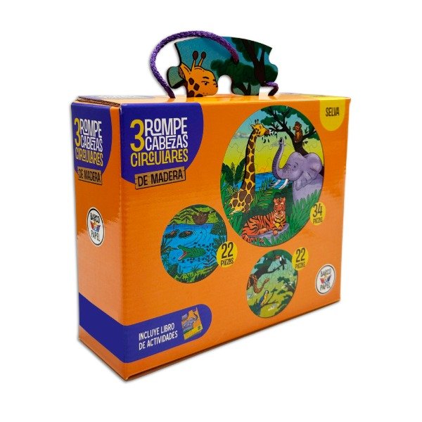 En esta caja vas a encontrar 3 rompecabezas circulares hecho en madera, super resistentes: