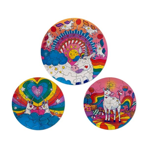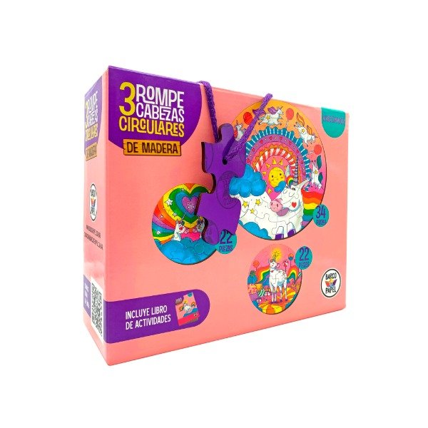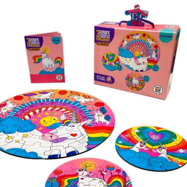 En esta caja vas a encontrar 3 rompecabezas circulares hecho en madera, super resistentes: