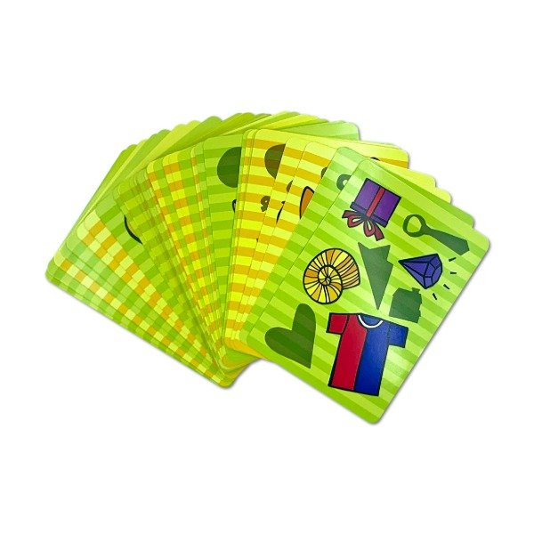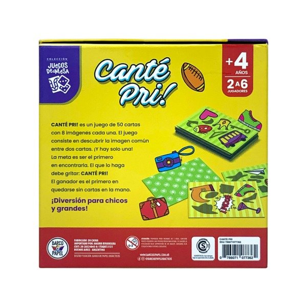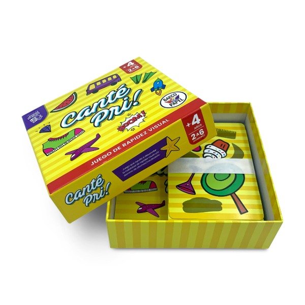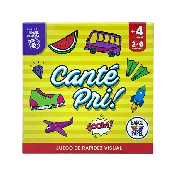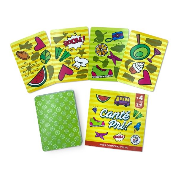 Canté Pri es un juego de cartas con 50 tarjetas ilustradas, cada una con 8 imágenes divertidas. Entre cualquier par de cartas siempre existe una sola coincidencia, y tu misión es descubrirla antes que los demás.