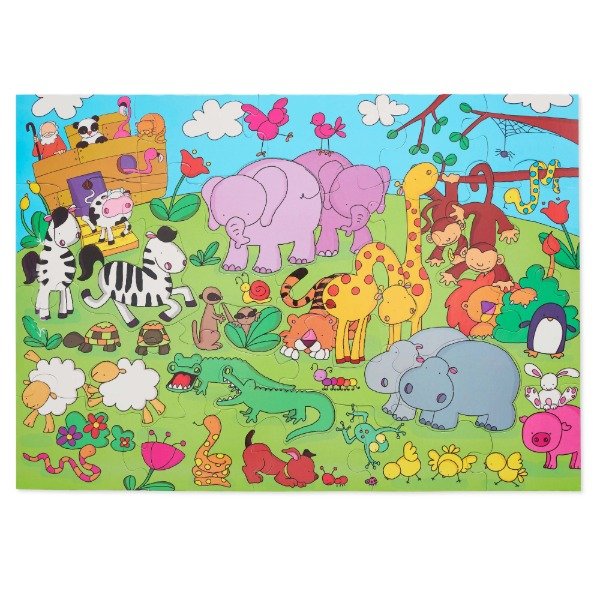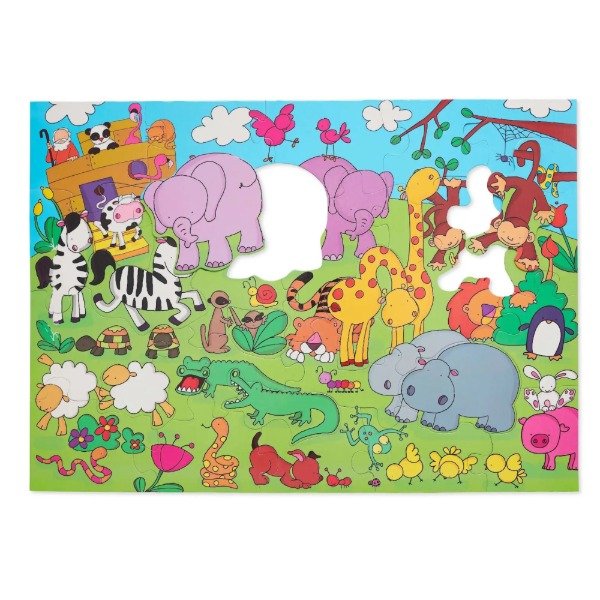 Armado mide 49 x 69 cm. Contiene 28 piezas extra gruesas. De las cuales 8 piezas se extraen enteras (cebra, elefante, jirafa, hipopótamo, cocodrilo, suricata, aoveja y mono)