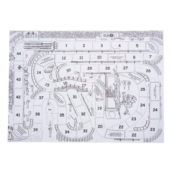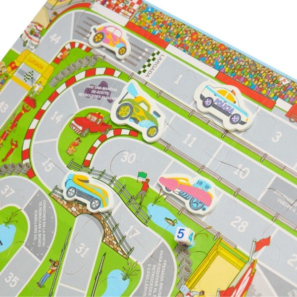 Una vez armado, es una pista de autos, que se puede utilizar como juego de recorrido. (cuenta con 1 dado + 4 autos en goma eva de carrera + crayones)