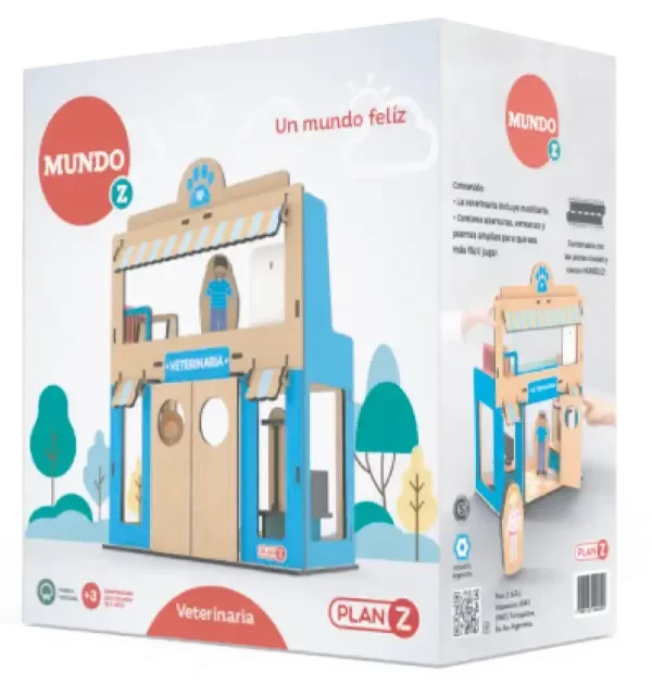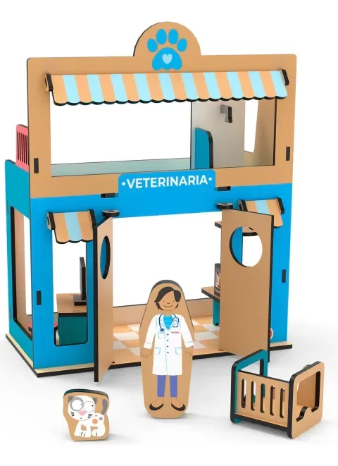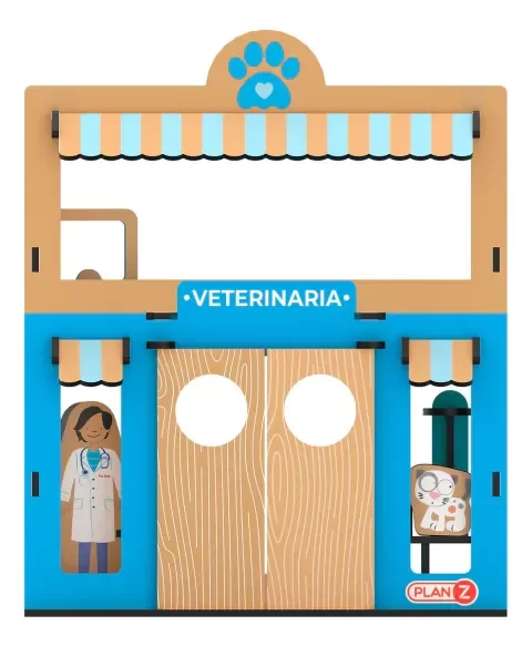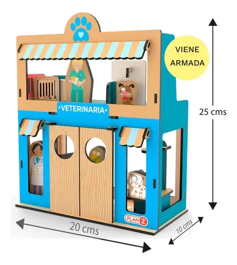 Incluye: 10 accesorios, Escritorio con PC, Banquito, Radiografo, Jaula, Lavatorio, Perro, Loro, Gato y 2 veterinarios