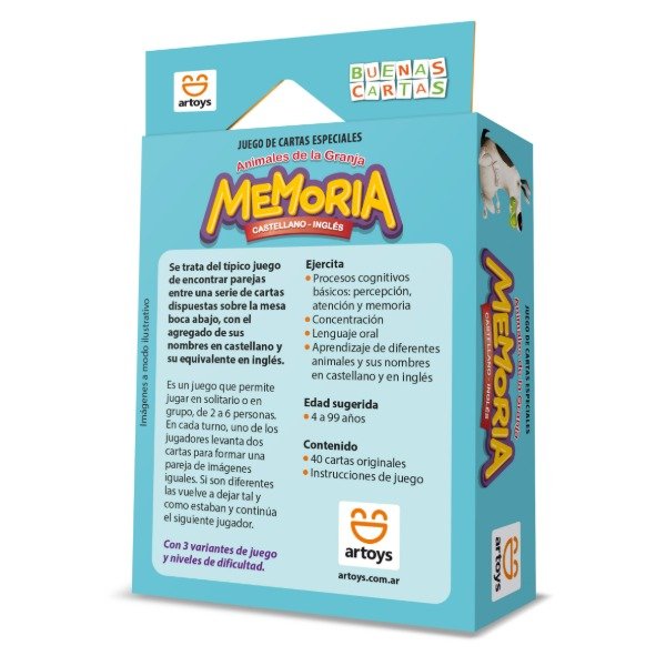 Se trata del típico juego de encontrar parejas entre una serie de cartas dispuestas sobre la mesa boca abajo, con el agregado de sus nombres en castellano y su equivalente en inglés.