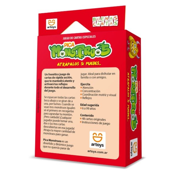 Se esparcen todas las cartas boca abajo y se giran de a una, por turnos. Cuando se vean tres monstruos iguales sé el primero en recogerlas para agrandar tu montón. ¡Pero cuidado! ¡Cualquier jugador puede tomar una, dos o las tres cartas descubiertas en esa jugada! Atrapa la mayor cantidad de monstruos para ganar.